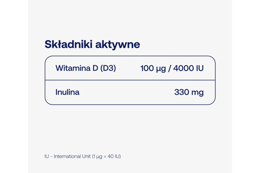 Porcja dzienna (1 kapsułka) zawiera: witamina D3 – 100 µg / 4000 IU (2000% RWS), inulina – 330 mg.