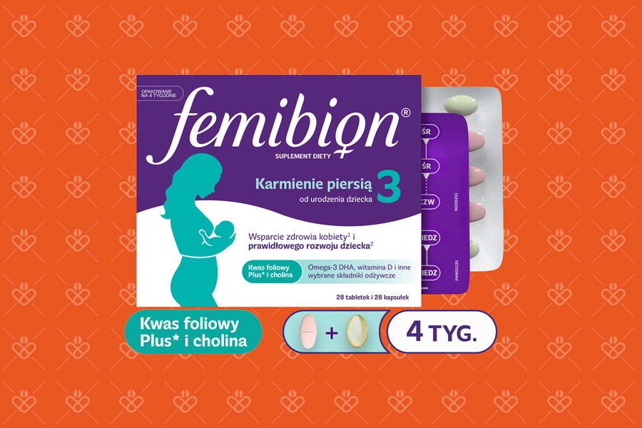 Femibion 3 Karmienie Piersią 28+28 to suplement diety dla kobiet w okresie karmienia piersią, przygotowany na 4 tygodnie stosowania w schemacie 1 tabletka i 1 kapsułka dziennie.