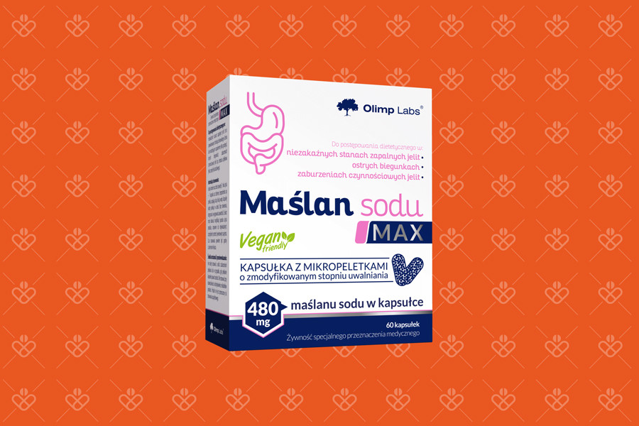 Maślan sodu MAX Olimp to produkt w kapsułkach zawierających maślan sodu w mikropeletkach. Taka forma ma sprzyjać wydłużonemu uwalnianiu składnika również w dalszych częściach przewodu pokarmowego. Kwas masłowy jest naturalnie wytwarzany w organizmie w jelicie grubym i stanowi źródło energii dla komórek nabłonka jelit.