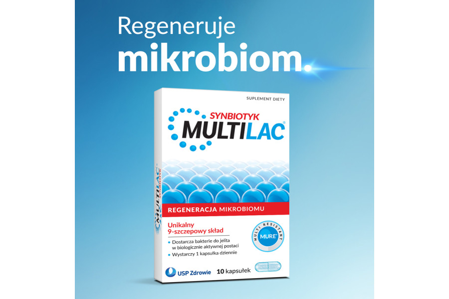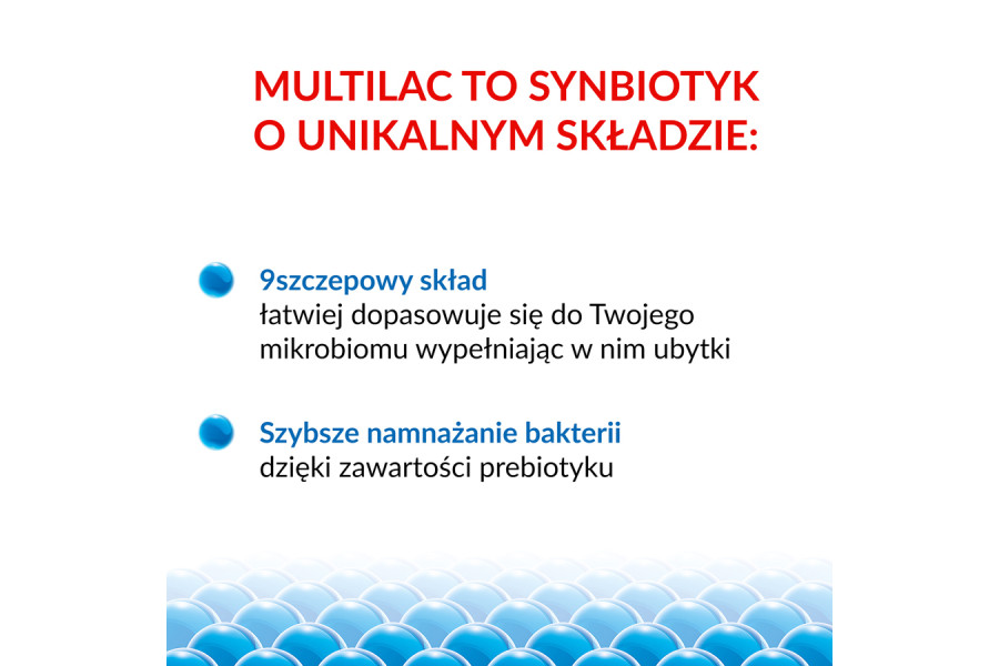 Multilac probiotyk to synbiotyk, czyli probiotyk i prebiotyk w jednej kapsułce. Probiotyk w kapsułkach z 9 szczepami bakterii oraz fruktooligosacharydami FOS. Opakowanie 10 kapsułek często wybierają osoby, które chcą zacząć od krótszego stosowania albo potrzebują wygodnej opcji do wyjazdu lub krótkiego czasu suplementacji.