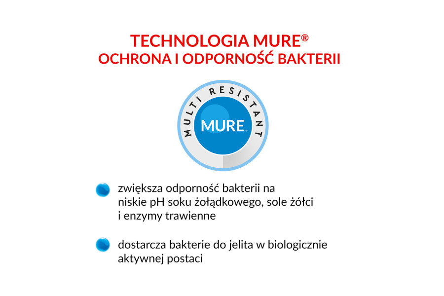 W jednej kapsułce znajduje się łącznie 4,5 miliarda bakterii probiotycznych, co opisuje parametr CFU. CFU to jednostka tworząca kolonię i informuje o liczbie żywych bakterii w porcji. W składzie jest także prebiotyk FOS, który stanowi pożywkę dla bakterii. Producent wskazuje również zastosowanie technologii MURE®, której celem jest ochrona bakterii podczas przechodzenia przez przewód pokarmowy do jelit.