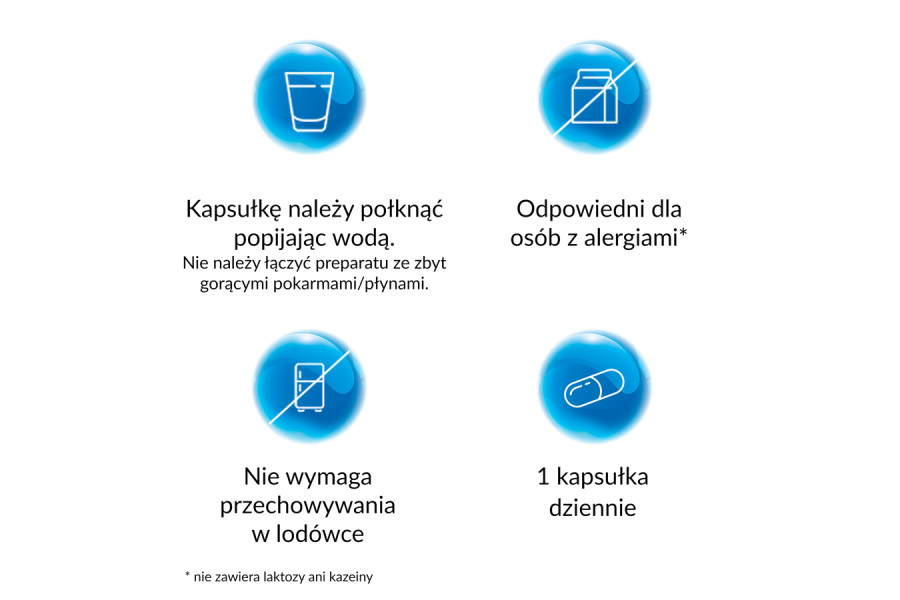 Zalecana porcja do spożycia w ciągu dnia to 1 kapsułka raz na dobę. Kapsułkę należy połknąć i popić wodą. Nie łączyć kapsułki z bardzo gorącymi posiłkami lub napojami.