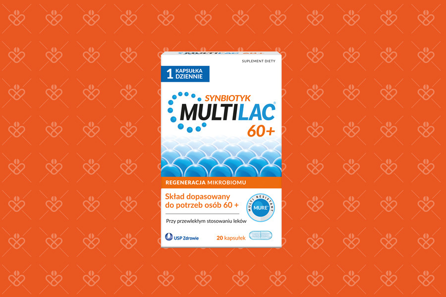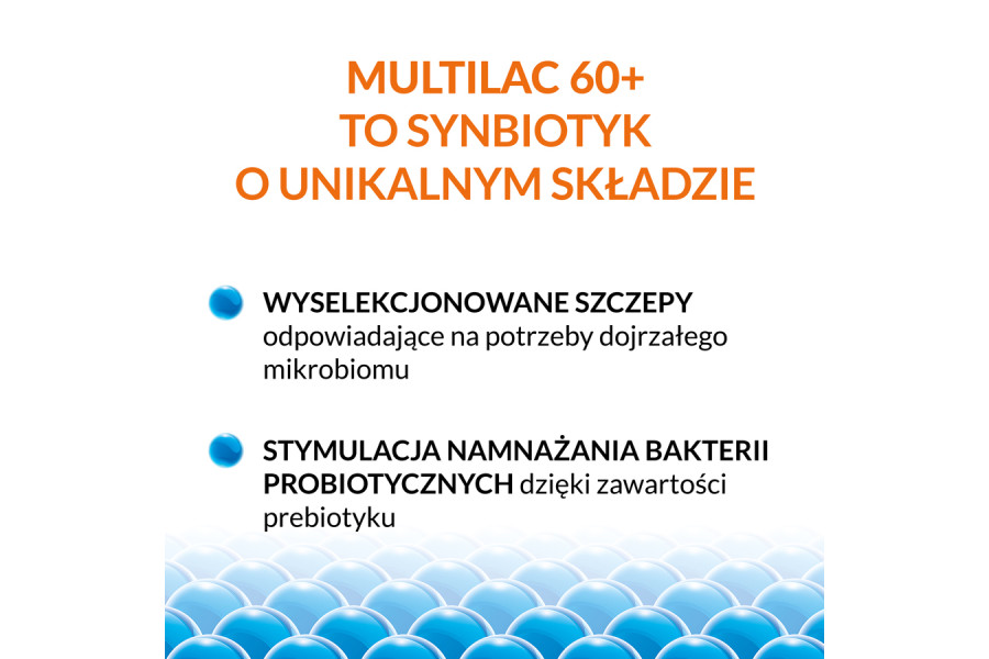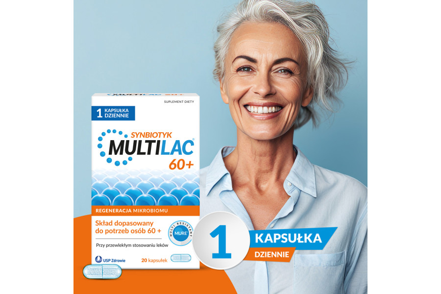 Multilac 60+ to suplement diety typu synbiotyk dla osób po 60. roku życia. Łączy probiotyk i prebiotyk, czyli 2 szczepy bakterii probiotycznych oraz fruktooligosacharydy. Produkt ma wspierać mikrobiom, który z wiekiem może się zmieniać, a dodatkowym obciążeniem bywa długotrwałe przyjmowanie leków. Multilac 60 plus ma wygodną formę kapsułek i zwykle stosuje się 1 kapsułkę dziennie.