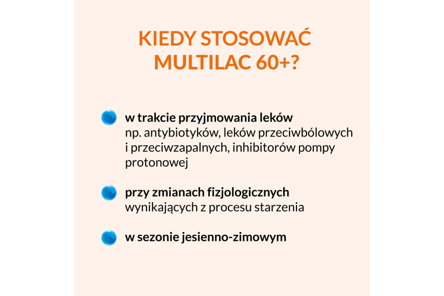 Multilac 60+ jest przeznaczony dla osób po 60. roku życia jako codzienne wsparcie mikrobiomu, także wtedy, gdy mikrobiom może być obciążany przez przewlekłe stosowanie różnych leków. Produkt bywa wybierany w okresach zwiększonej dbałości o odporność, na przykład w sezonie jesienno-zimowym.