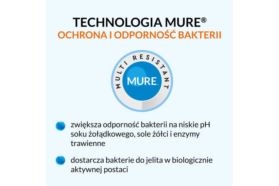 Zastosowana technologia MURE, określana jako Multi Resistant, ma zwiększać odporność bakterii na czynniki takie jak niskie pH soku żołądkowego, sole żółci, enzymy trawienne oraz wahania temperatury, aby mogły dotrzeć do jelit w biologicznie aktywnej postaci.