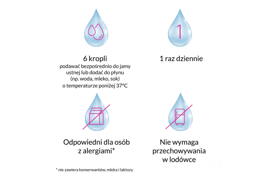 Zalecane spożycie wynosi 6 kropli 1 raz na dobę. Krople można podawać bezpośrednio do jamy ustnej albo dodać do płynu o temperaturze poniżej 37°C, na przykład do wody, mleka lub soku.