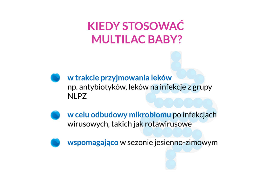 Multilac dla niemowląt i Multilac dla dzieci można stosować przy zmianach mikrobiomu, na przykład po infekcjach wirusowych oraz w trakcie stosowania antybiotyków lub leków z grupy NLPZ. Produkt bywa wybierany także w sezonie jesienno-zimowym, gdy wiele osób chce zadbać o dietę dziecka w kontekście mikrobiomu.
