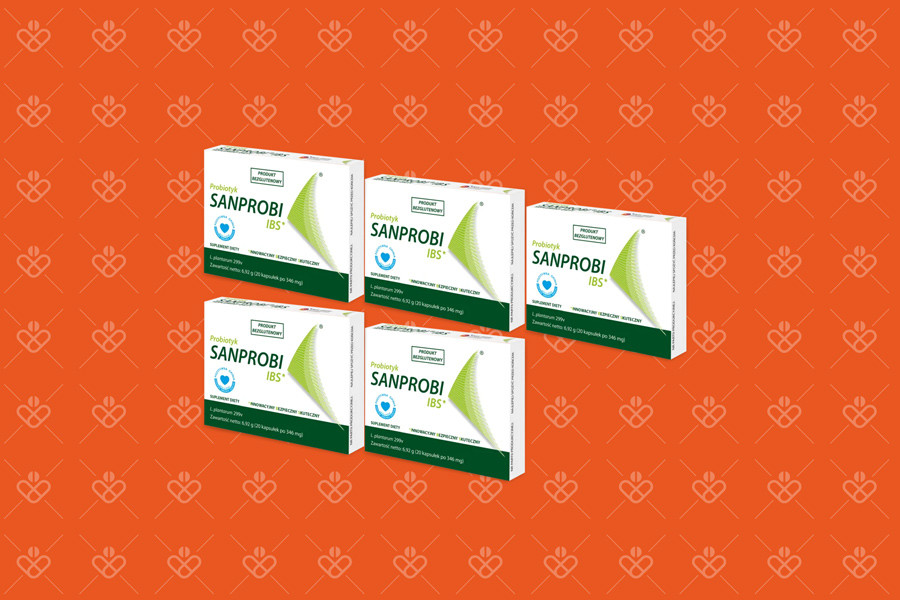 Zestaw pięciu opakowań suplementu diety Sanprobi IBS, zawierającego bakterie probiotyczne Lactobacillus plantarum 299v. Produkt przeznaczony jest dla dorosłych, młodzieży i dzieci powyżej 3. roku życia, także dla kobiet w ciąży i karmiących piersią.