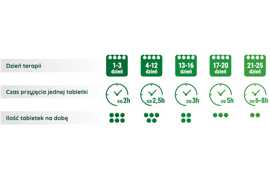 | Od 4 do 12 dnia | 1 tabletka co 2,5 godziny | 5 tabletek |