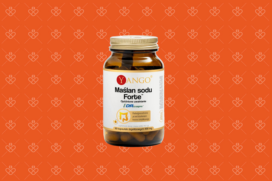 Yango Maślan Sodu Forte to suplement diety w kapsułkach DRcaps® o opóźnionym uwalnianiu, przeznaczony dla osób dorosłych, które chcą uzupełnić dietę w maślan sodu. Jedna kapsułka zawiera 360 mg maślanu sodu, a zalecana dzienna porcja 3 kapsułek dostarcza 1080 mg maślanu sodu. Surowiec jest standaryzowany na zawartość minimum 71,2% kwasu masłowego, dzięki czemu wiadomo, ile kwasu masłowego znajduje się z porcji.